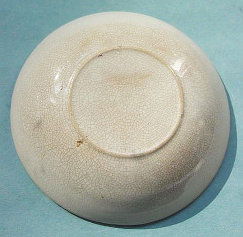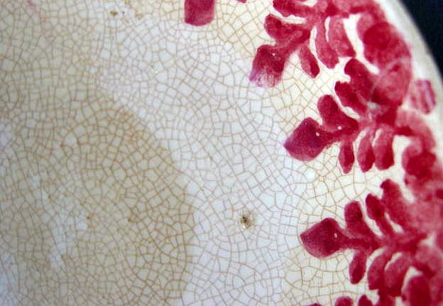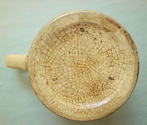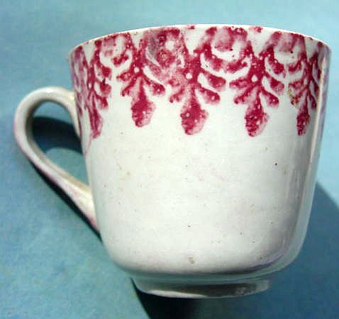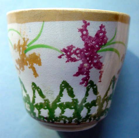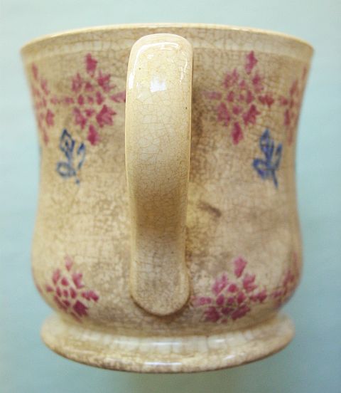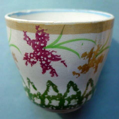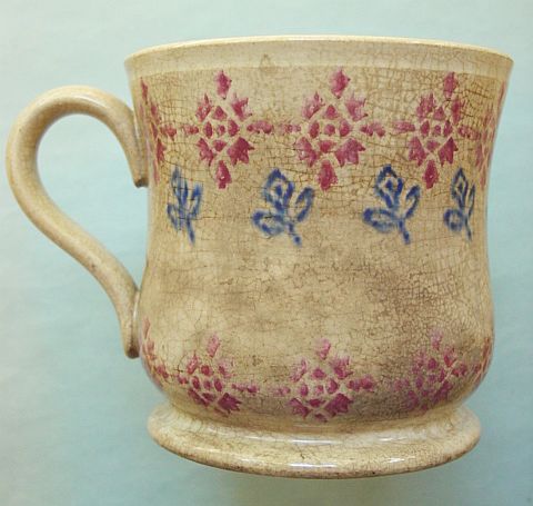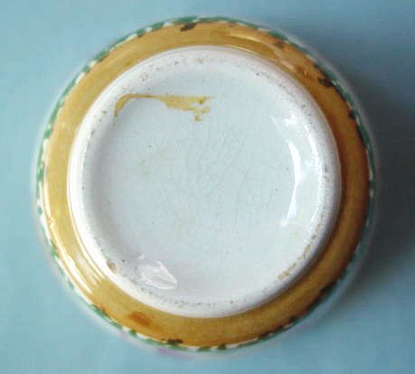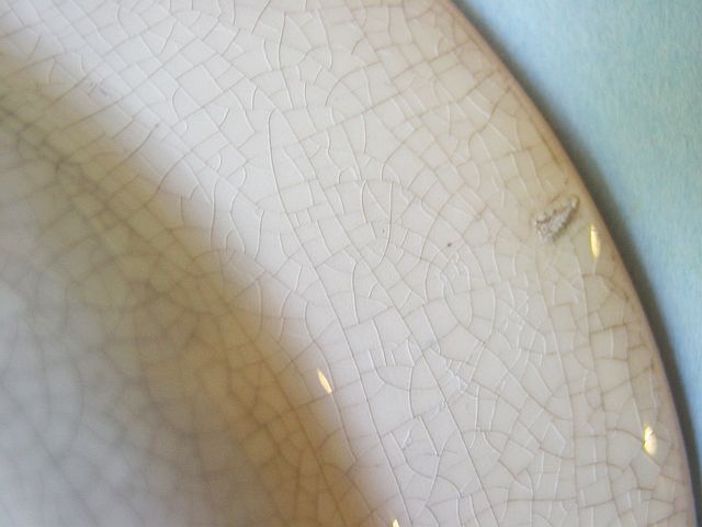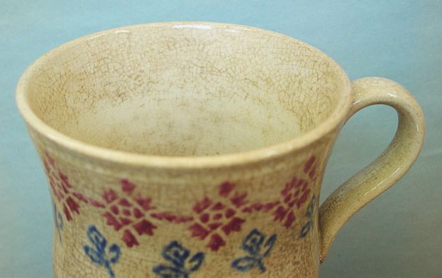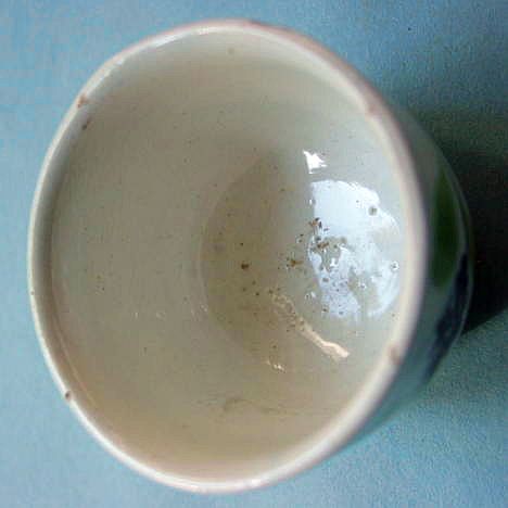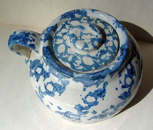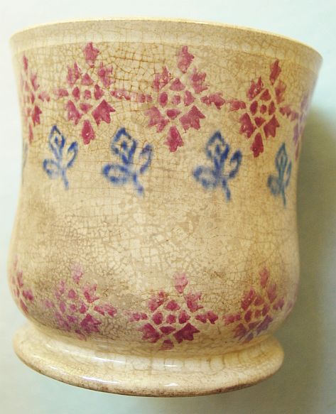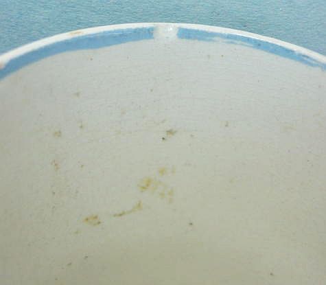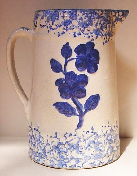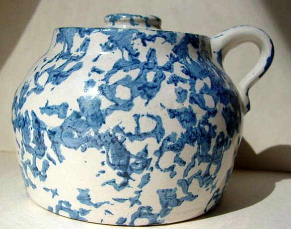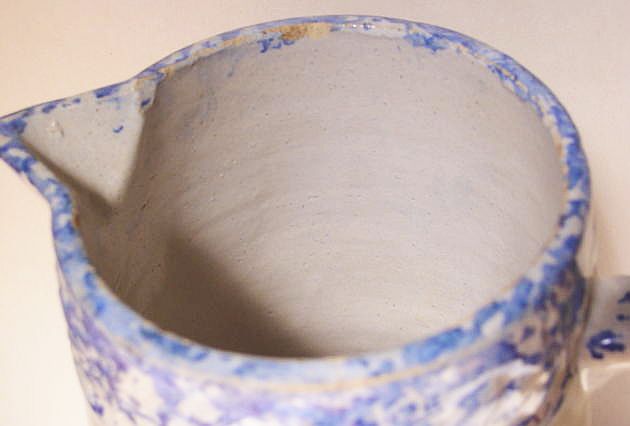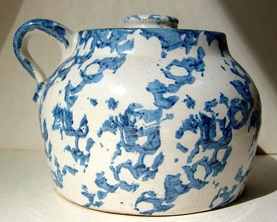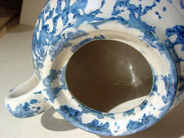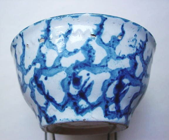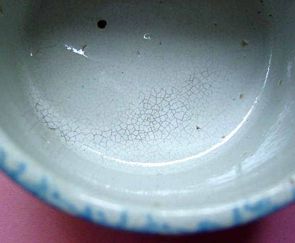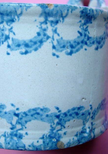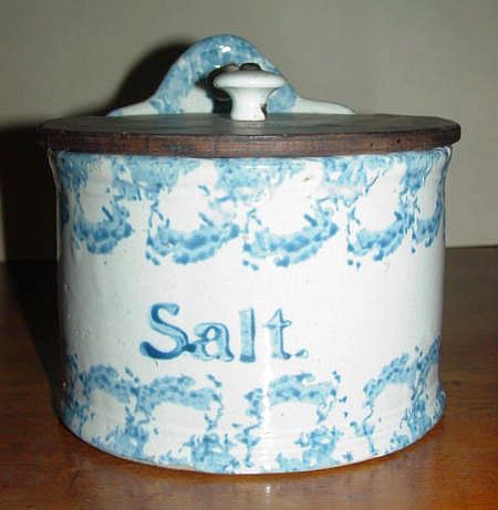 A wonderful blue and white hand decorated spongeware salt box. The wooden lid is probably not original but is about 100 years old. The knob has a 3/8" chip. There are two 1/4" chips on the right side of the base. There is a tight 3 1/2" hairline on the left side that goes throgh. There is a 1/8" shallow chip on the back of the hanger. When looking straight at the box, the only flaw that one sees is the knob chip. A difficult to find piece. Additional photos are attached by the magnifying glass icon.