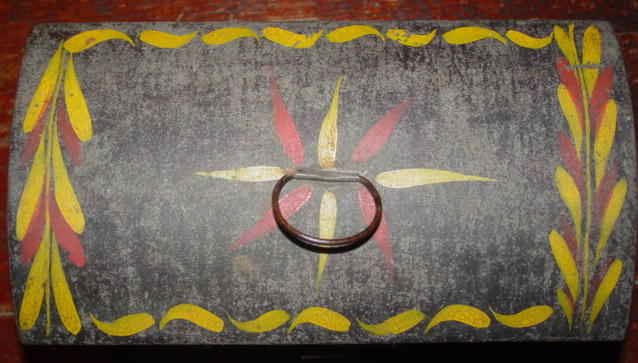 Original paint decorated toleware deed box with a swag design. The black painted background shows wear but the lovely motifs are still colorful and bright. The paint shows crazing from age. The hasp is missing but the box retains its original handle. There are no touch-ups or overpainting and overall a beautiful piece. Additional photos are attached by the link to the right.