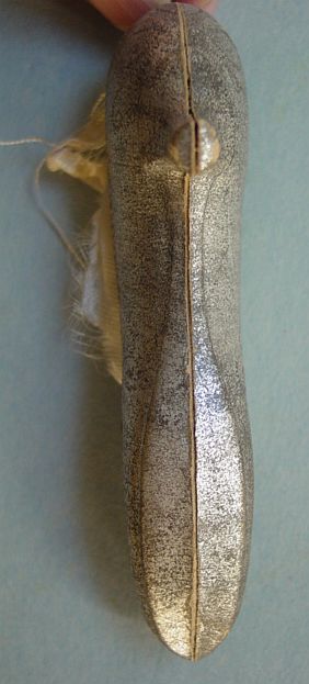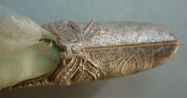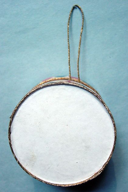 A large patriotic dresden drum candy container with embossed gold dresden drumsticks on top. Embossed gold dresden paper in the center and a red, white and blue sawtooth border. It separates for candy retrieval. There is minor wear on the top and a very slight dent. Overall, in excellent condition. Additional photos are attached by the magnifying glass icon.