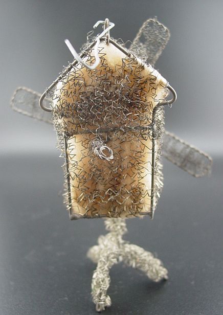 A rare sebnitz windmill ornament. It is on a wire frame filled with cotton batting and elaborately wrapped with curly wire. There is an embossed scrap of a Victorian girl on the front of the windmill under the wire wrapping. There are yellow gel windows on each side. The blades are wire framed and wrapped with crinkle wire. An amazing piece in excellent condition. Additional photos are attached by the magnifying glass icon.