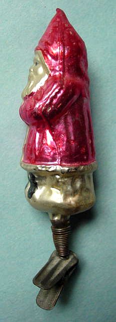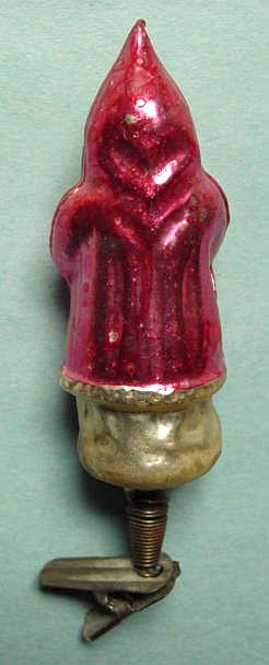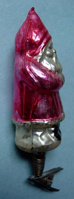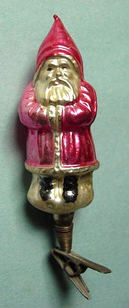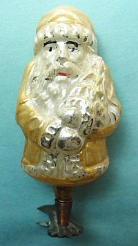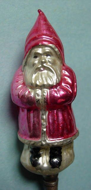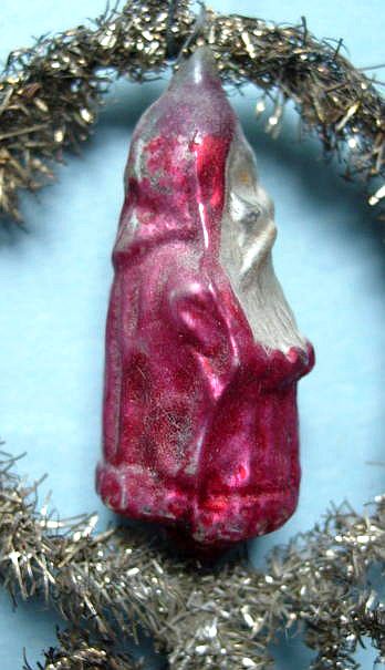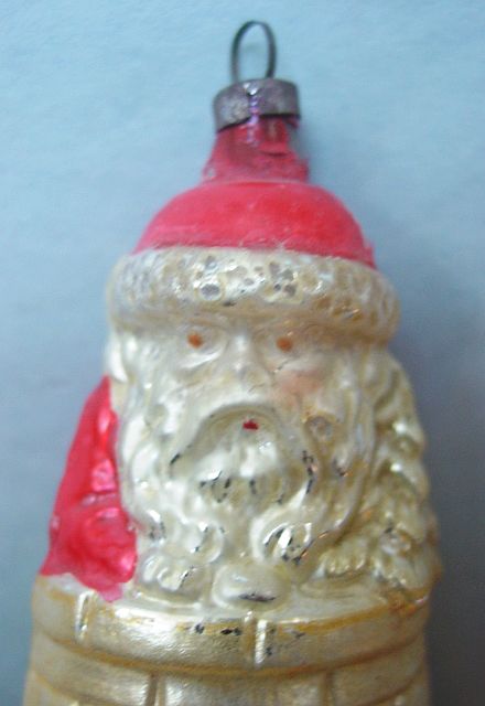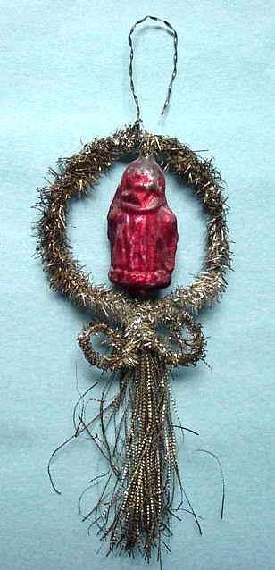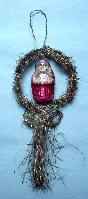 Rare early glass Santa bead ornament with a lametta tinsel comet tail in a tinsel circle. There is some oxidation and a small chip at the top of the pike. Otherwise, the Santa is in a long red coat with minor paint wear. A wonderful piece. Additional photos are attached by the magnifying glass icon.
