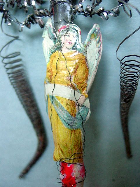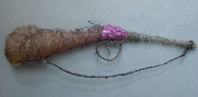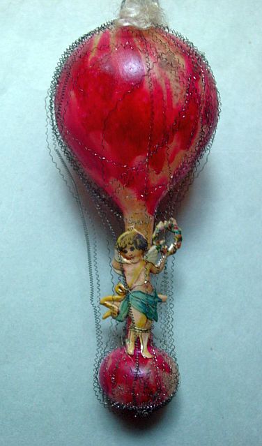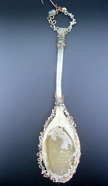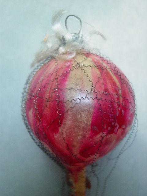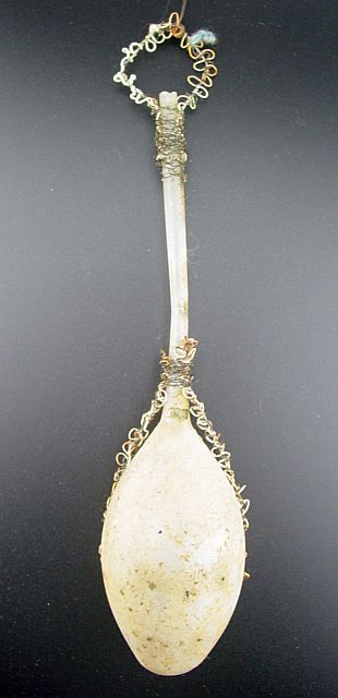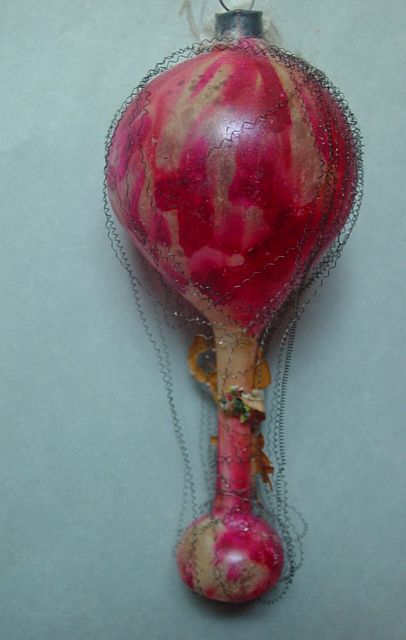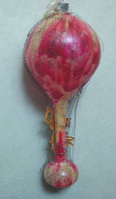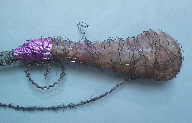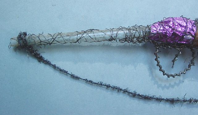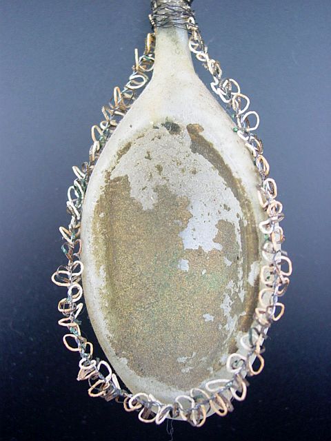 A very early unsilvered glass spoon ornament. Decorated with heavy curly wire around the bowl and also forms the hanger. Painted in a soft pastel white that shows a little wear. The center of the bowl appears to be old tarnished gold paint. There is wire wrapping at the top of the bowl and top of the pike. A great piece. Additional photos are attached by the magnifying glass icon.