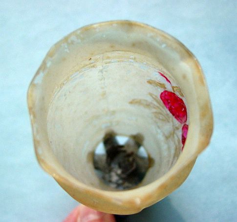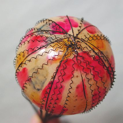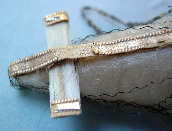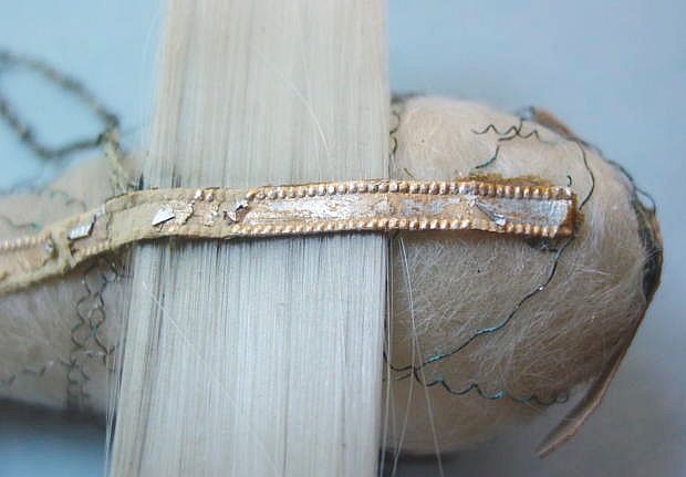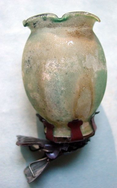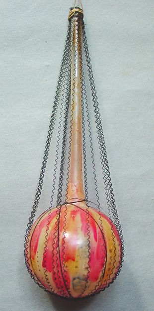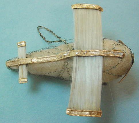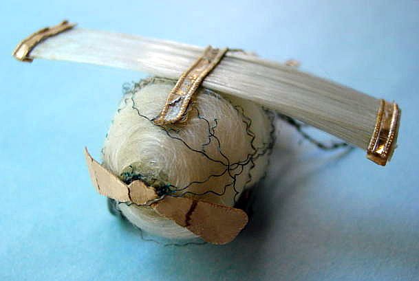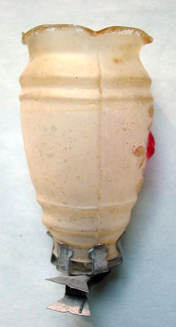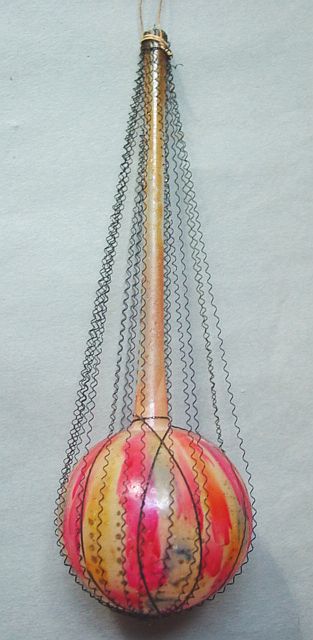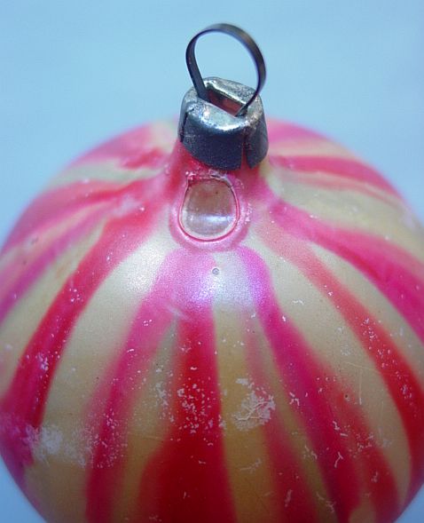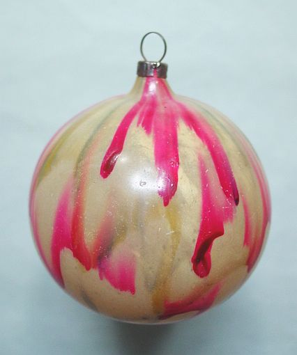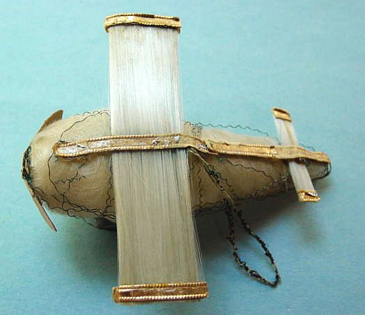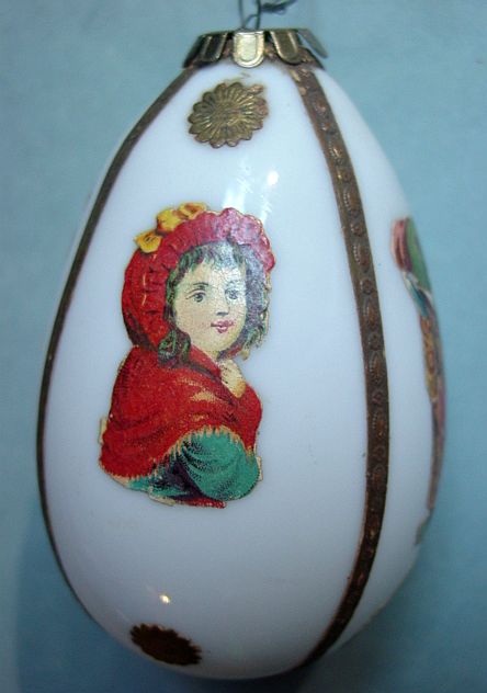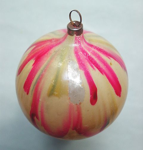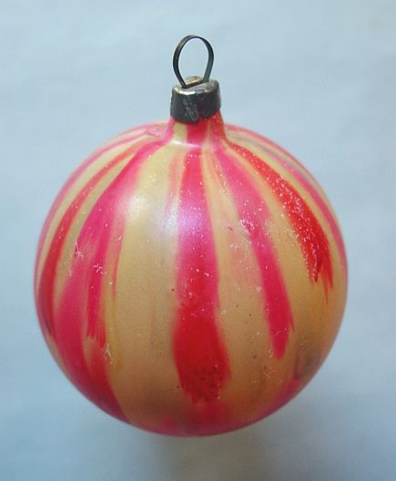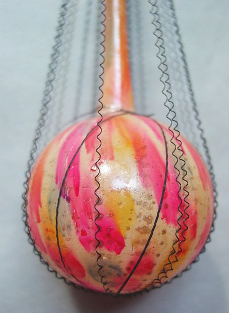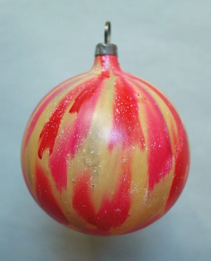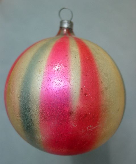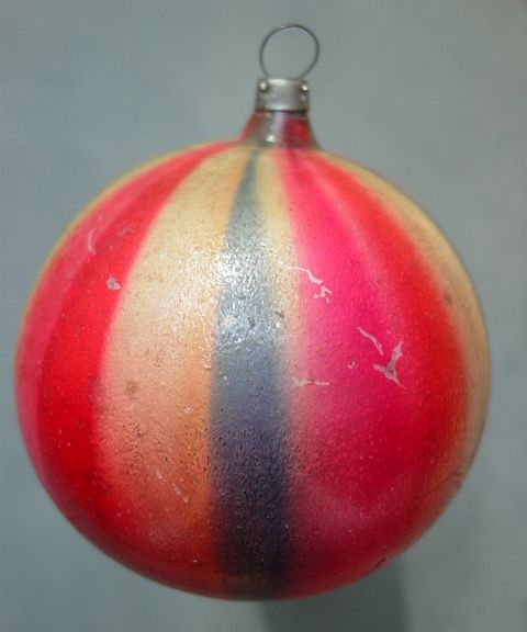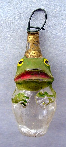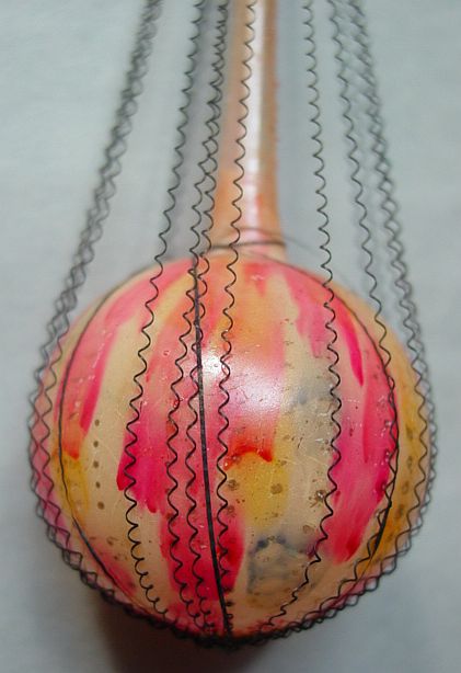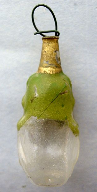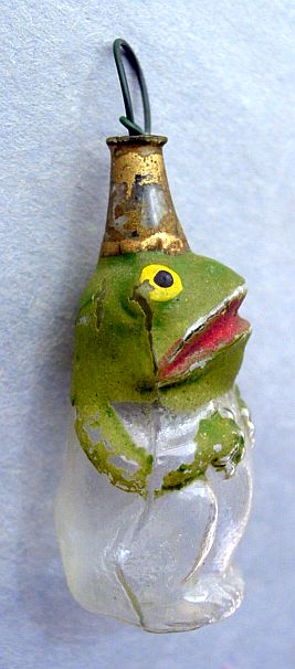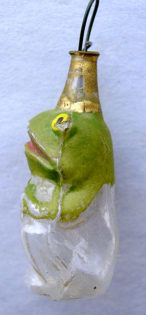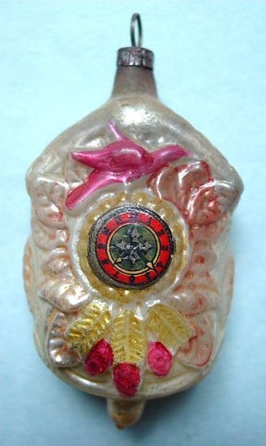 A rare glass airplane that is wire-wrapped and also wrapped in spun glass. It also has spun glass wings attached to the top and rear of the plane. There is dresden trim on the top of the fuselage and on the wings. It has a paper propeller and small metal wheels. It also retains its original tinsel cord hanger. Overall, in excellent condition. Additional photos are attached by the magnifying glass icon.