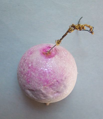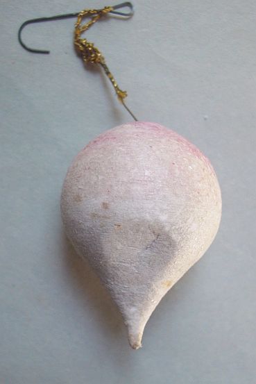 Early spun cotton beet with pink shading. Covered with mica flakes to make it sparkle. It has a few dents and a wire loop. It has a tinsel cord which can also be used for hanging. Additional photos are attached by the magnifying glass icon.