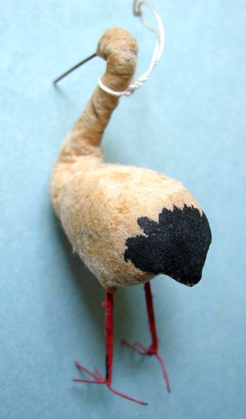 A terrific wire-wrapped cotton bird house with a cardboard base and cardboard roof covered with glitter. There are two tiny red composition berries on one side and a tiny bit of tucksheer on the other side. There is an embossed scrap of a bird nestled on flowers on the front. There is a crease on the lower right corner of the base, mostly noticeable on the underside. The base is also stamped "Germany". Except for minor discoloration to the cotton from age, it is in excellent condition. Additional photos are attached by the magnifying glass icon.