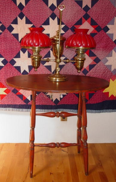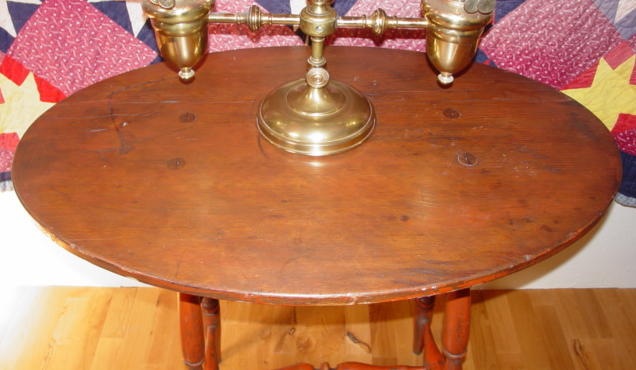A rare and unusual stand designed to hold two hogscraper candle holders, so that there would be ample light to work by. The mortised T-base is extra large and heavy, so that there would be no chance the stand could tip over. The octagonal work shelf is attached to a support cleat fastened by hand wrought rosehead nails. The cleat rests upon a collar notched out of the tapered shaft. The hogscraper support is adjustable and held in place by a threaded stop.