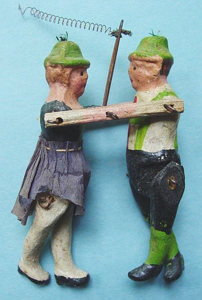 Rare, two-piece winter display scenes constructed of wood and heavily covered with mica to simulate glistening snow. The church has red, cardboard stained glass outlines that surround the tissue paper windows. The people, trees and lamp post are beautifully airbrushed painted chalkware. The second piece also has a wood base edged with moss and covered with mica. The airbrushed chalkware painted figures include a playful puppy and a boy throwing snowballs. The sled also has two big red composition berries on the ends of the rope. The gentleman on this piece has minor damage to his foot, otherwise it is in excellent condition. The church has two cutout holes in the back to allow a small bulb to be inserted to light it . This piece is also in excellent condition. Additional photos are attached by the magnifying glass icon.