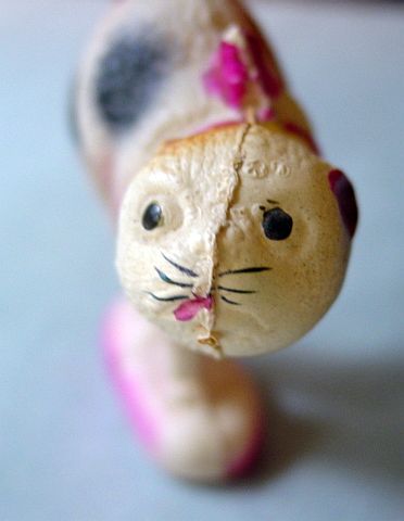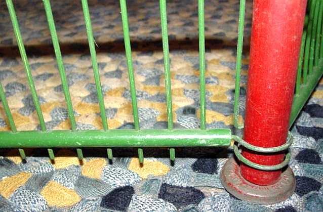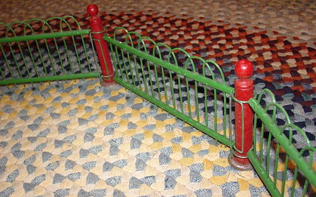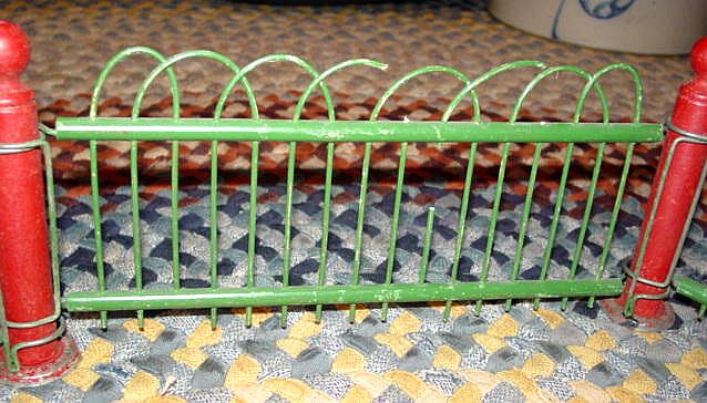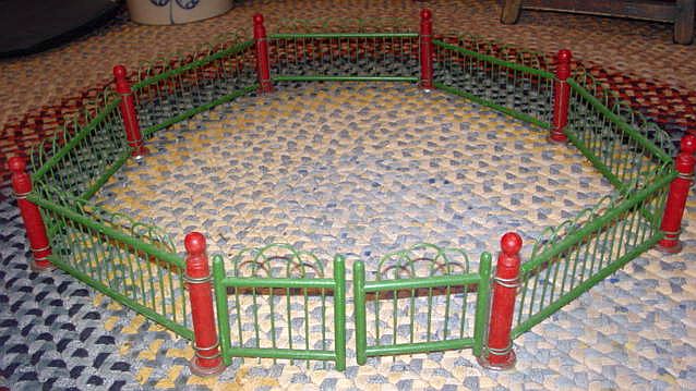 A wonderful early wicker Christmas tree fence. There are seven sections of fence and two swing gates. The fence posts are wood and painted red. Their bases are tin and show some paint wear. They are stamped with the maker, "Pat'd A. W. Drake Mfg. Co., Hazelton, Pa". The loops that attach the fence together are metal. The fence is bent wicker painted green. There are a few breaks to the wicker but because of the intricate design it is only noticeable upon closer inspection. Overall, a rare fence in great shape. Additional photos are attached by the magnifying glass icon.