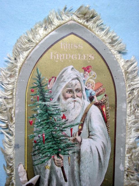A fantastic and rare gold fringe booklet titled, "Kriss Kringle's Christmas Greeting", published by Peter Paul and Brother, Buffalo, N.Y. and H.B. Nims and Co., Troy, N.Y.. Held together by its original silk ribbon and complete with tassels. A beautiful print of Father Christmas in a long white coat on front and holly and berries on the back. The booklet is filled with poems and sheet music. Except for some thinning fringe and one loose page, it is in excellent condition. Additional photos are attached by the magnifying glass icon.
