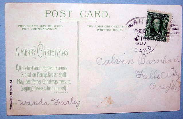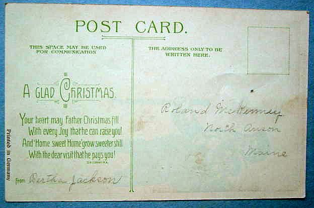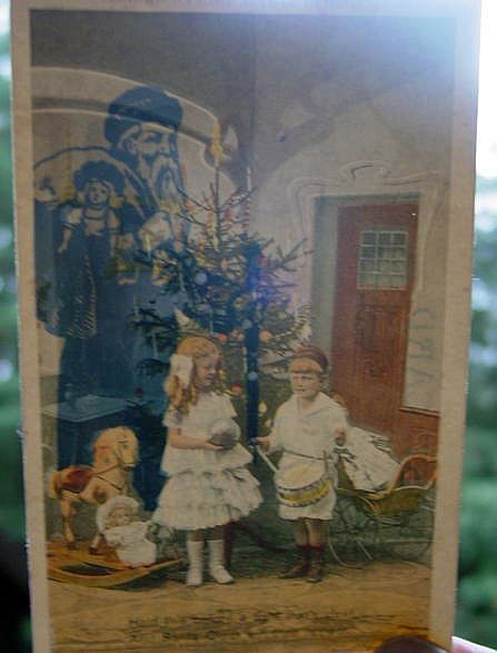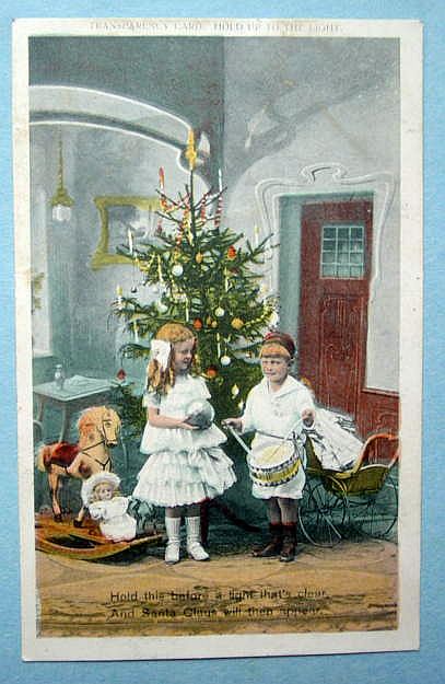A beautiful, rare hold-to-light Christmas postcard from the same series as the one below. A boy and a girl are playing with their toys, a doll and rocking horse. Surrounded by snow covered holly leaves and berries. A serene night time winter scene with cottages and stars in the sky, completes the picture. The left edge of the card has a ding and a 1" crease and the lower left corner has a spot of wear. Postally used and dated 1910. Overall, a fantastic card. Additional photos are attached by the magnifying glass icon.