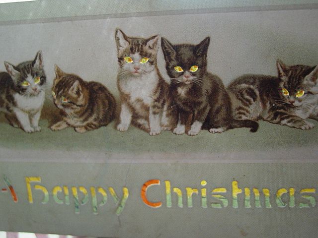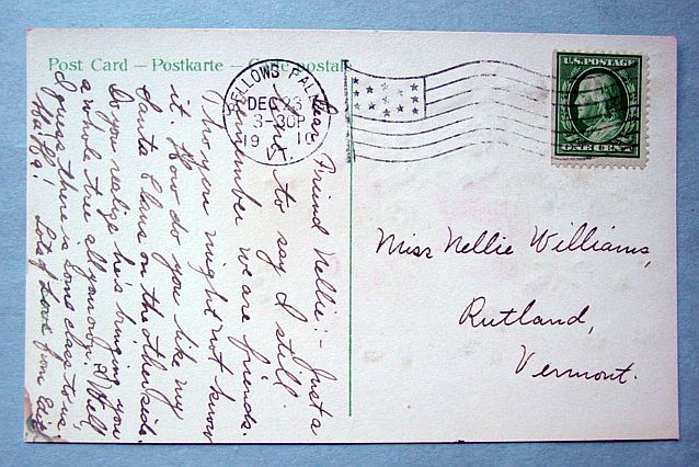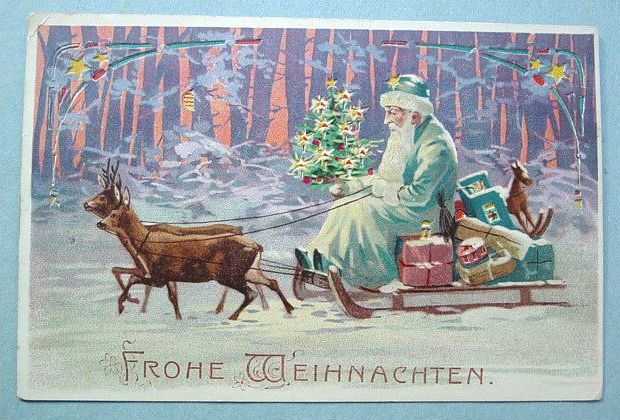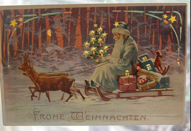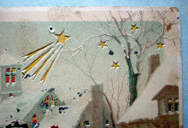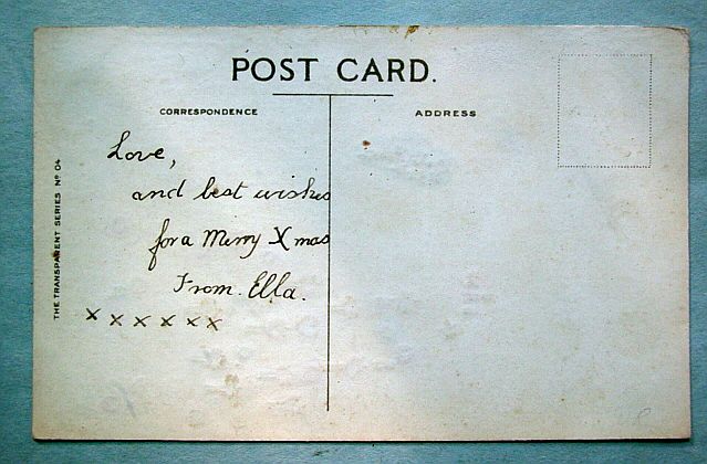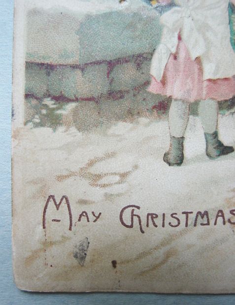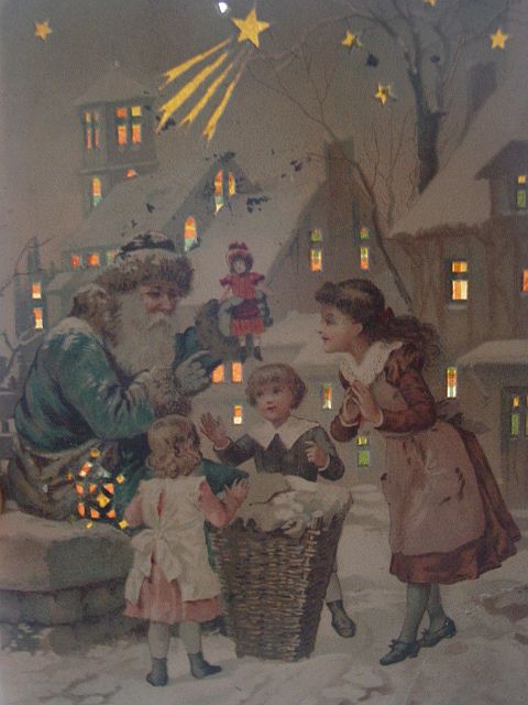 A rare hold-to-light Christmas postcard with Santa in a long green coat setting toys on a window sill while two children sleep inside. There are initials lightly written on the lower right hand corner. Postally used and dated either 1903 or 1905. There is a very minor bend, hardly noticeable, on the top left hand corner. Otherwise, the condition is excellent. Additional photos are attached by the magnifying glass icon.