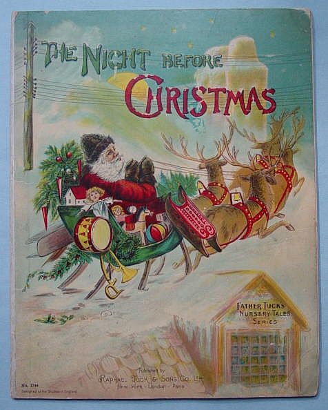 A softcover children's Christmas shape book titled, "The Night Before Christmas" published by Raphael Tuck and Sons Co. LTD New York, London, Paris.There are five full page color lithograph prints including the cover and numerous black and white illustrations. It has a stapled spine. The interior pages have slightly darkened from age and handling but are clean without writing or scribbling. The front cover has two long creases. The back cover has some missing paper near the spine and two water marks. Also, a 3/16" missing piece on the left side edge. All in all, a charming and very collectible book in very good condition. Additional photos are attached by the magnifying glass icon.