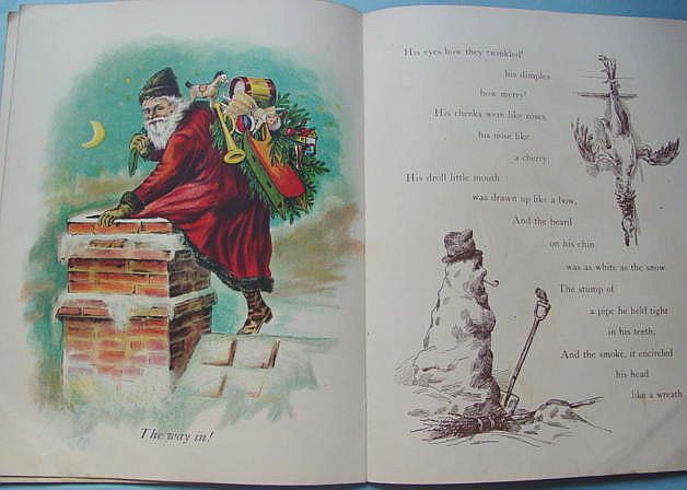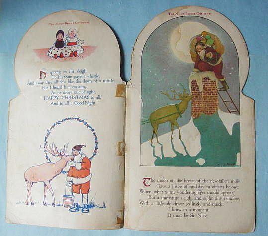 A beautiful softcover children's Christmas book titled, "The Night Before Christmas", published by Saalfield Pub. Co., Akron, Ohio. No copyright date, but dates early 1900's. There is an inscription on the inside cover that dates Dec. 25, 1931, but the book is earlier than that. Every page is a full page color lithograph illustrated by Frances Brundage. There is some discoloration from age and handling. The front and back covers have some creases and the corners have wear. The prints are bold and bright. Overall, in great shape. Additional photos are attached by the link to the right.