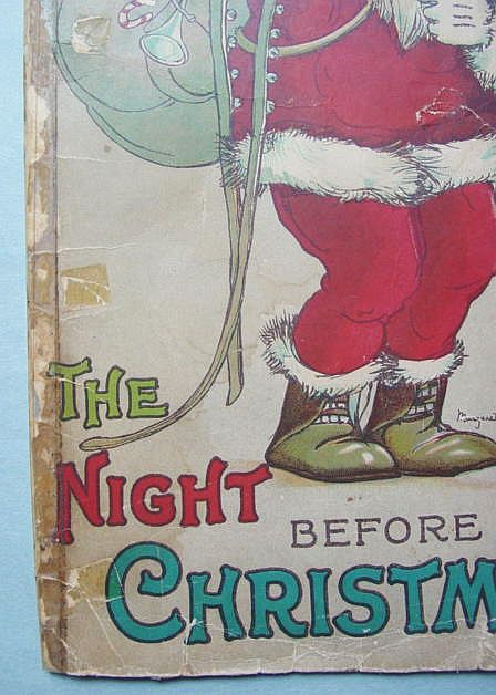 A semi-hardcover edition of "The Night Before Christmas" published by McLoughlin Bros. Inc., Springfield, Mass. No copyright date but dates early 1900's. There is a bend at the lower left corner, some minor creases on the cover and wear at the upper right corner. All pages are intact and there are four full page color lithographs. Colors are clear and bright and this wonderful book is in overall excellent condition. Additional photos are attached by the link to the right.